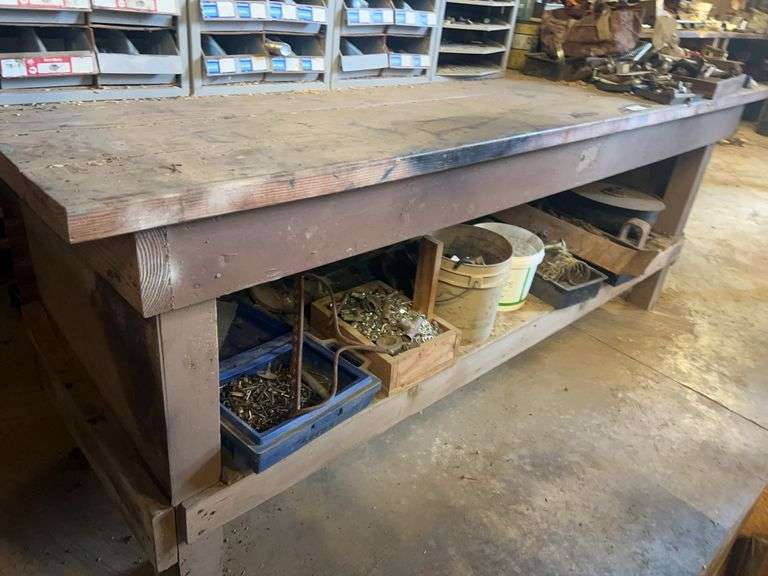 LOT 171 - 28" x 94" L Wooden Shop Table & Contents